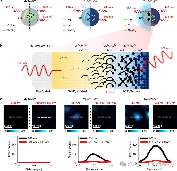 1.智能结构设计:他们将负责吸收光能的镱离子和负责发光的铥离子,分别放置在纳米颗粒的壳层和核心,人为创造了一个从外到内的能量传递通道。
