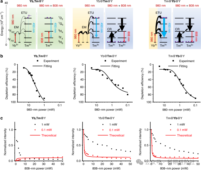 图1:使用双光束照射探测基于拓扑能量转移网络的核壳上转换纳米颗粒的上转换发光,用于上转换受激发射损耗显微镜研究