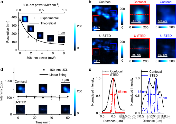 3.实现低功耗高清成像:得益于这一高效能量网络,系统仅需使用强度为0.03MW/cm²的微弱激发光(980纳米激光)和1MW/cm²的耗尽光(808纳米激光),就能成功"开关"纳米颗粒的发光,并最终获得65纳米的横向分辨率。相较于现有最好方法,激发光强度降低了10倍,耗尽光强度降低了3倍。