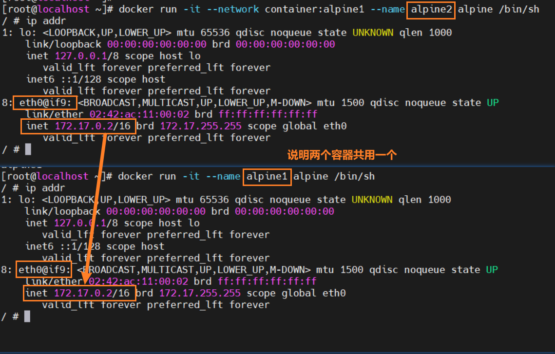 docker run -it --network container:alpine1 --name alpine2 alpine /bin/sh