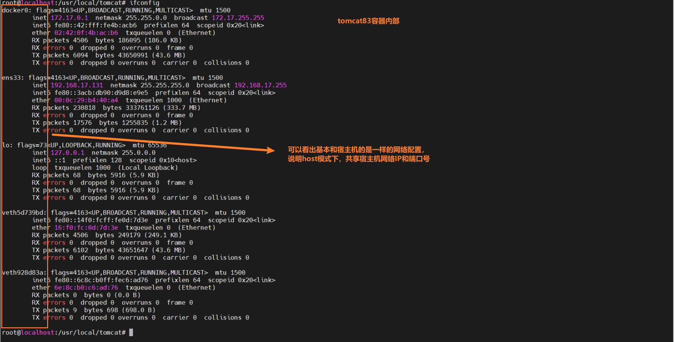 进入容器内部,发现网络配置和宿主机的网络配置是一样的