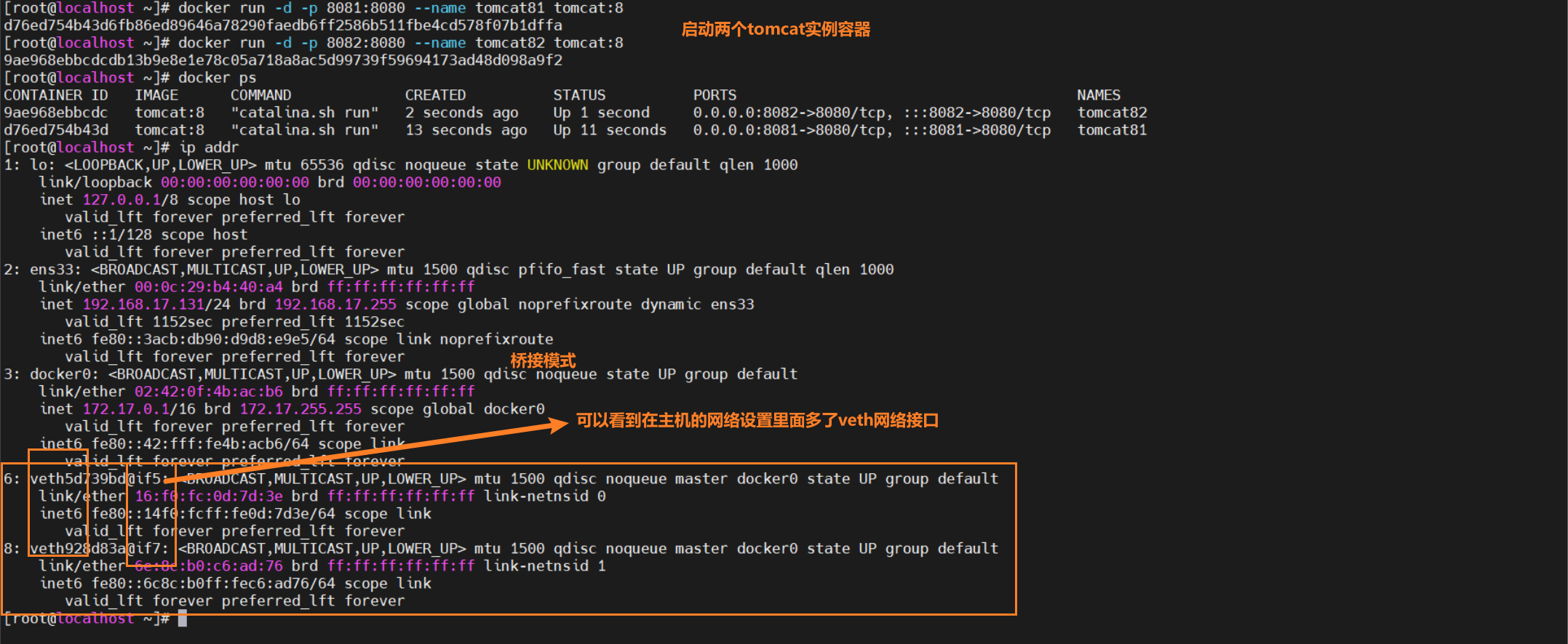 注意:主机内部的veth和容器内部的网络接口eth0两者是一一匹配的关系。