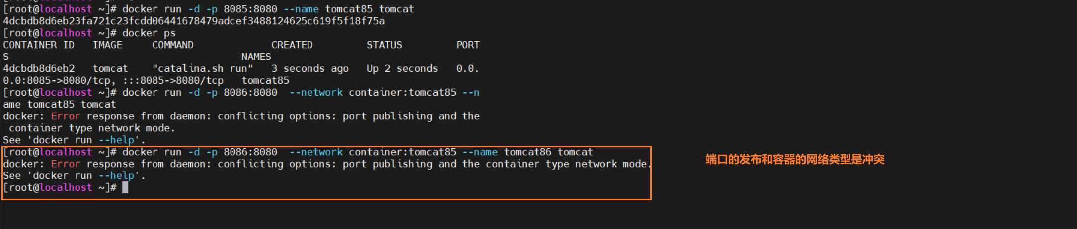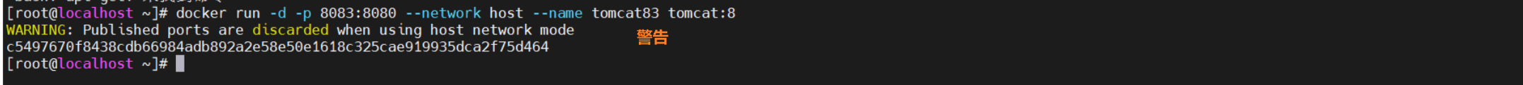 原因:Docker启动时指定--network=host或-net=host,如果还指定了-p映射端口,此时就会出现这样的警告信息,并且通过-p设置的参数将不会起到任何作用,端口号会以主机端口号为主,重复时则递增。
