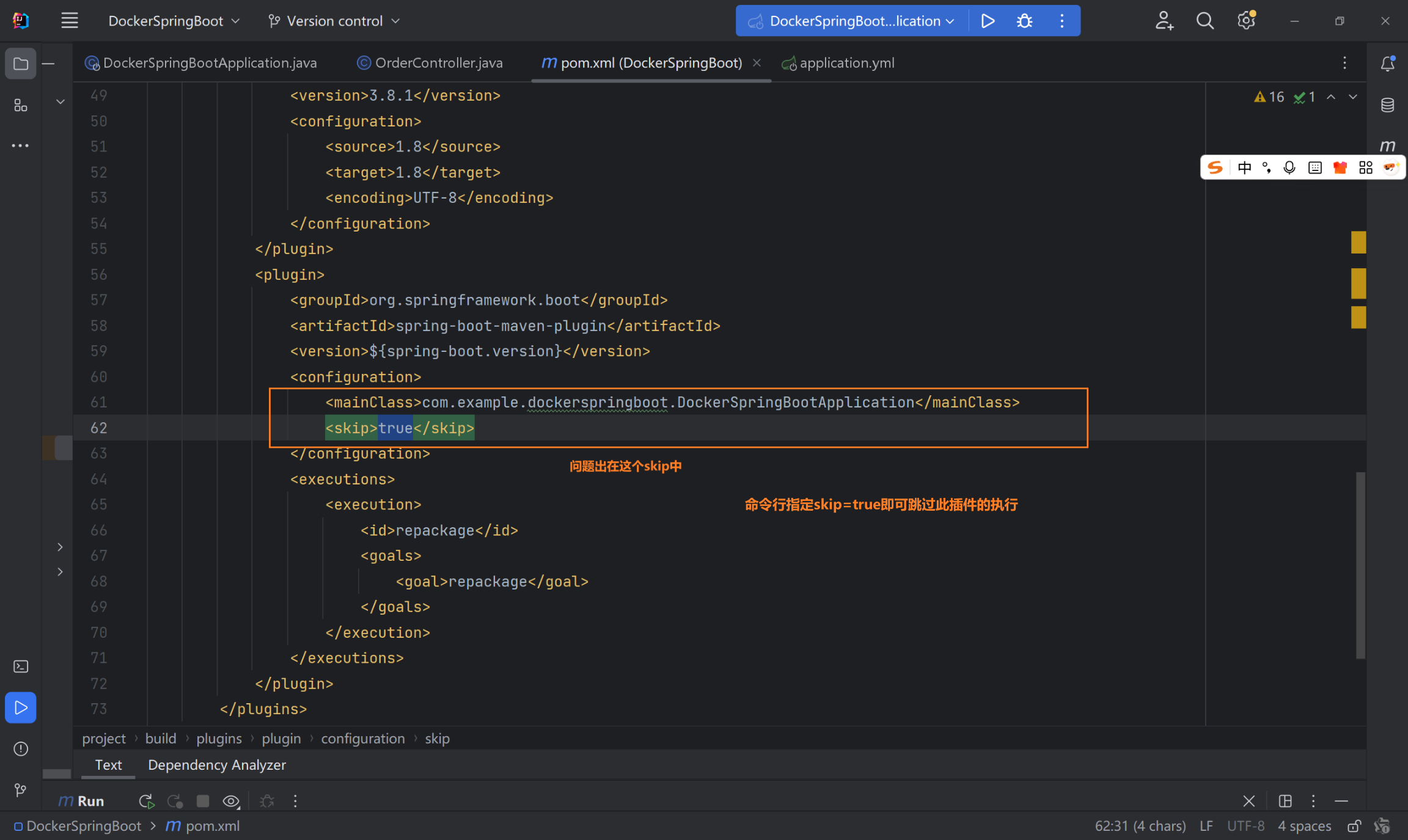 当在 pom.xml中将 Spring Boot Maven 插件的 参数设置为 true时,执行 mvn package进行打包,这个插件会完全被跳过。