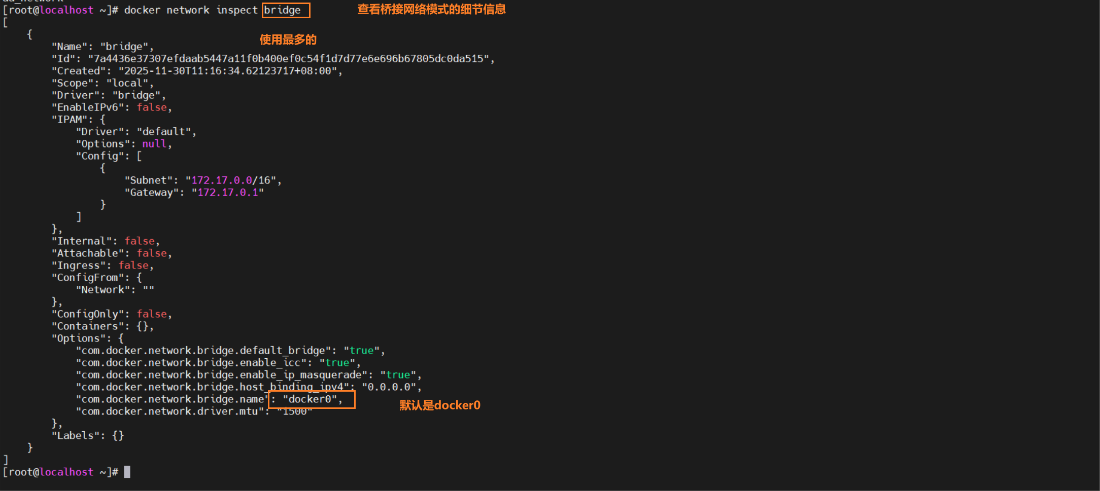 docker network inspect # 展示一个网络的细节信息