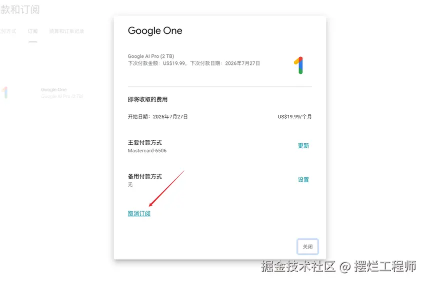 **路径:**进入 Gemini 首页 -> 设置 -> 管理订阅 -> 更改付款方式 -> 管理 -> 订阅。