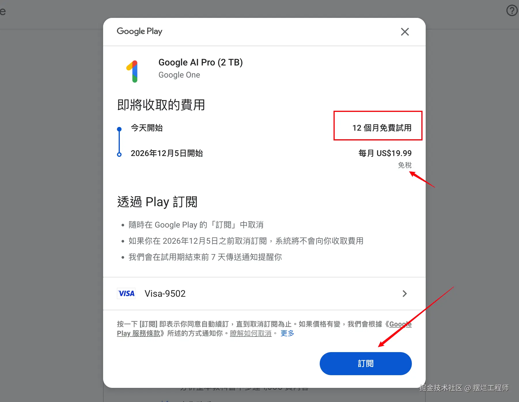 弹窗会自动关闭,然后等待一会,会再次弹出确认订阅的窗口,这里确保是12个月,并且免税的情况下,点击 订阅。