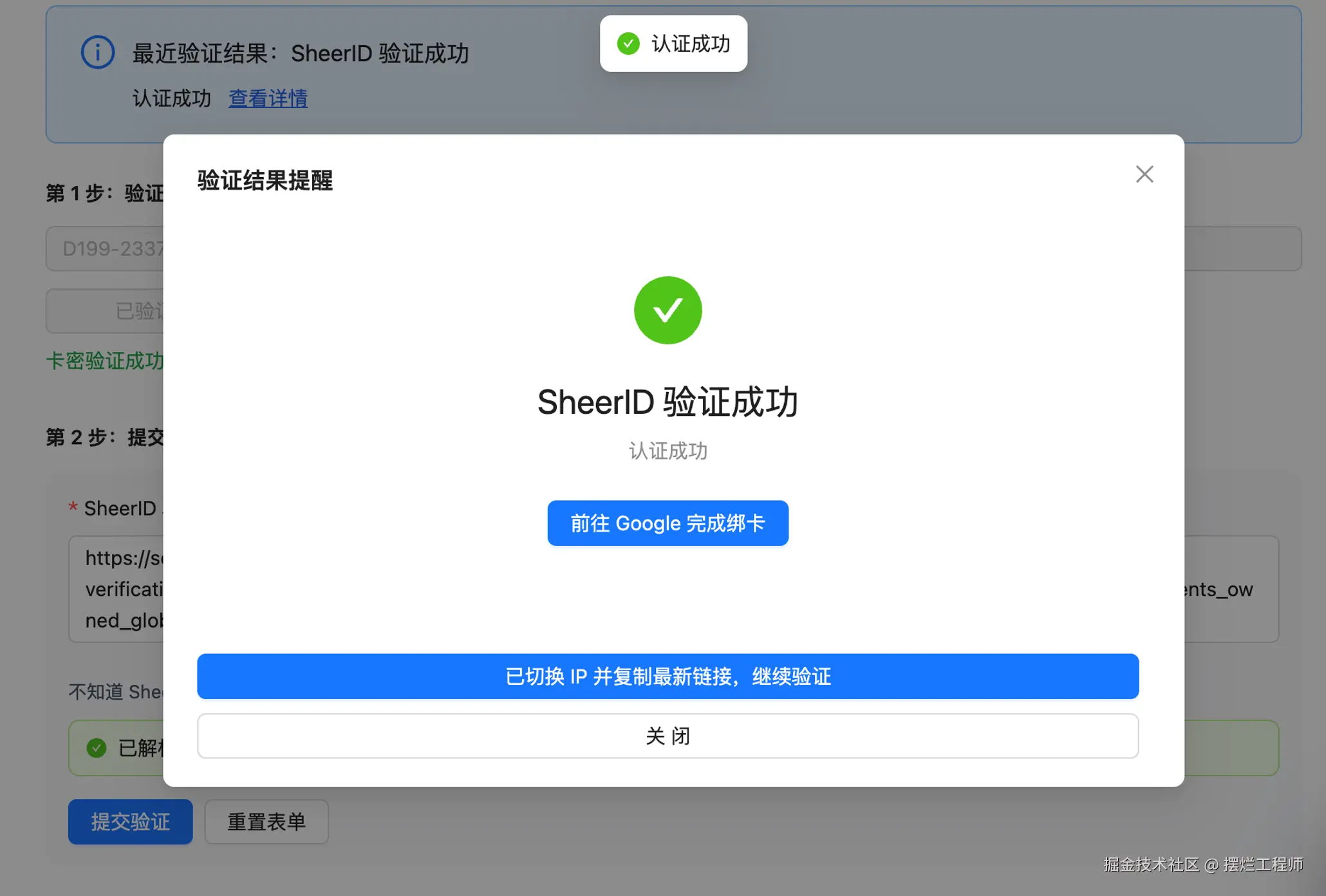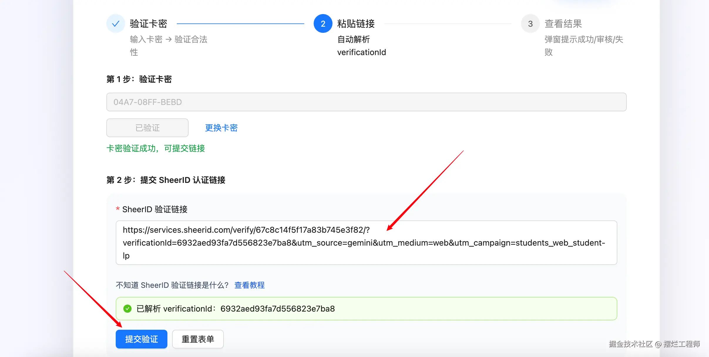 把你的 Sheerid 链接 粘贴进来,会自动识别当前的验证ID,点击提交之后,等待1~2分钟就完成认证。
