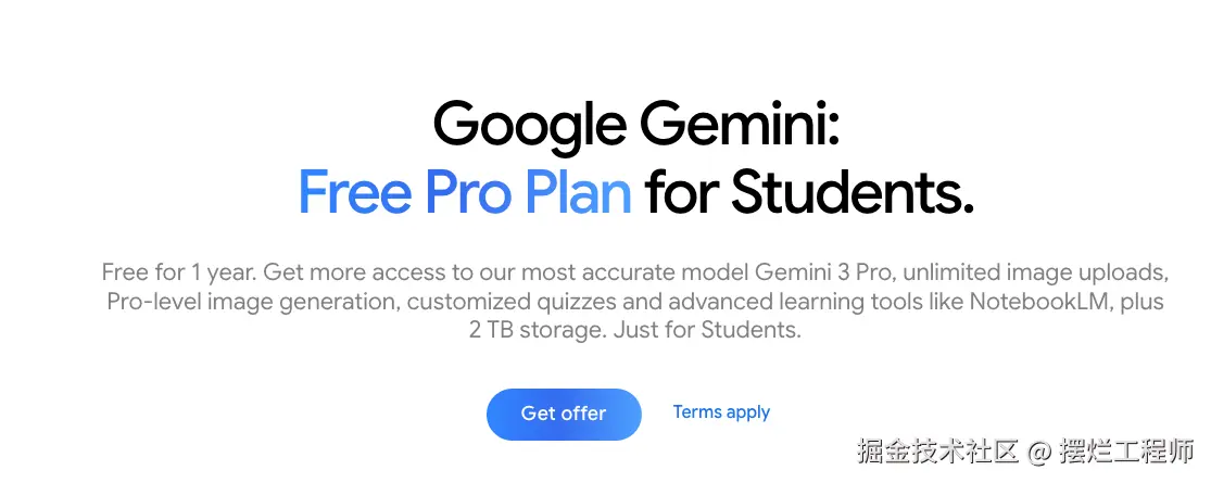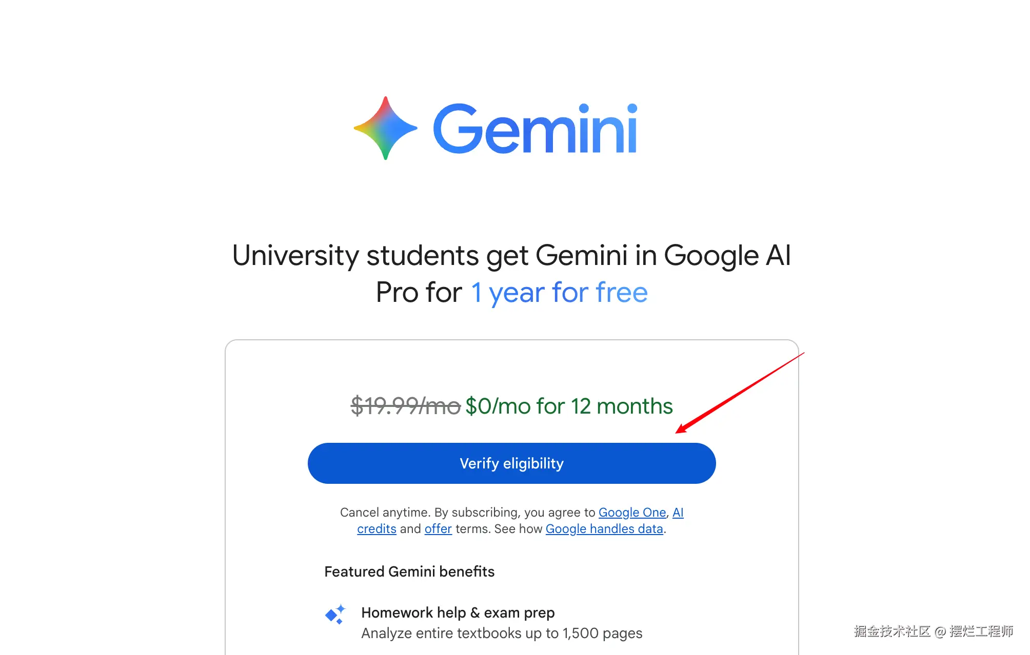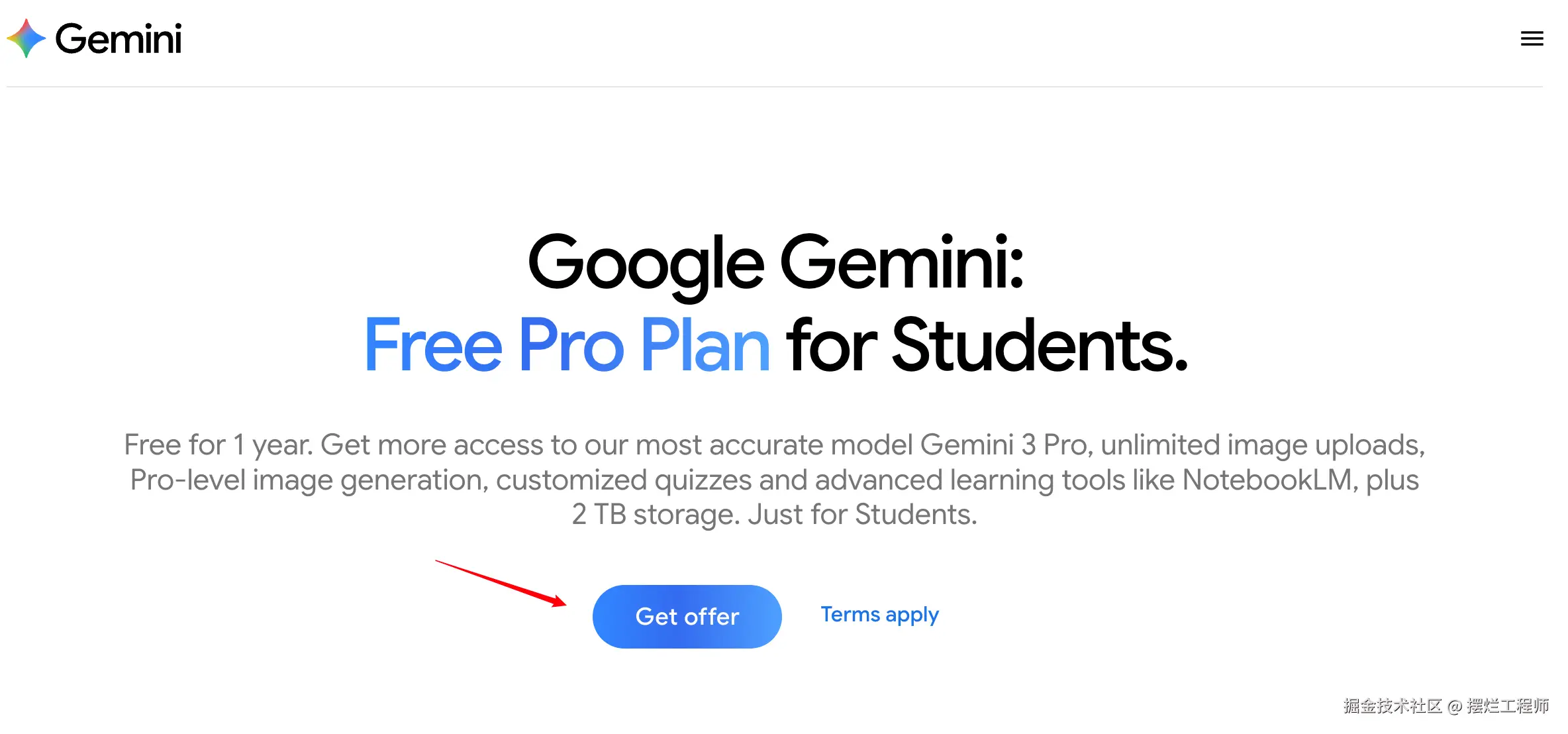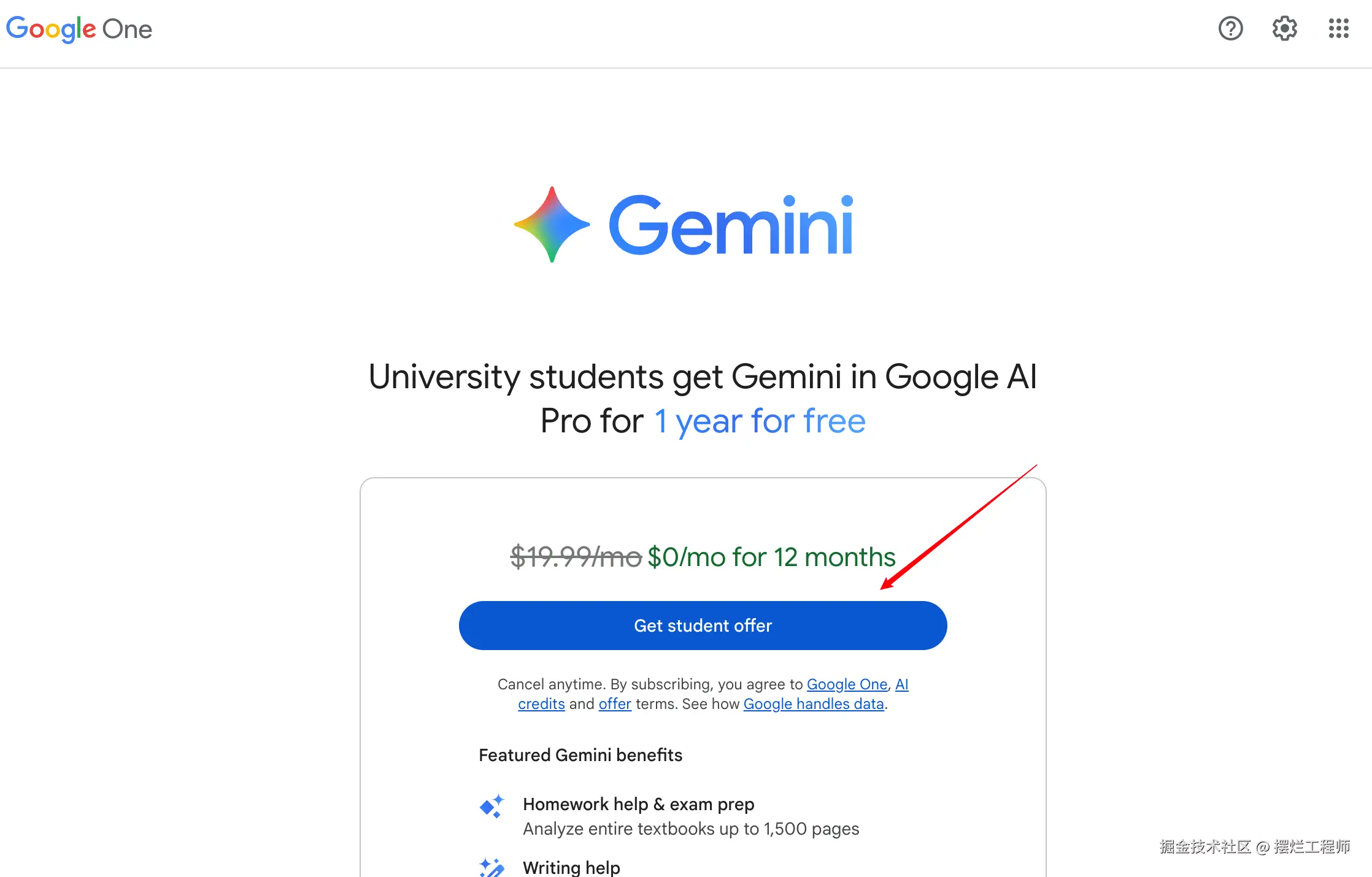 打开活动地址:https://gemini.google/students/ 点击 Get offer 就可以进入到获取验证链接到页面。