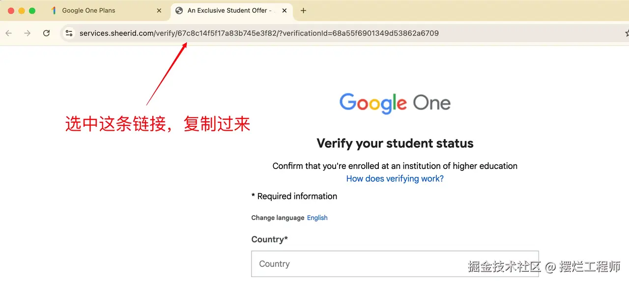 打开的页面,浏览器的导航里面的地址就是 Sheerid 链接!!! ,这个链接带着谷歌分配好的 verificationId。