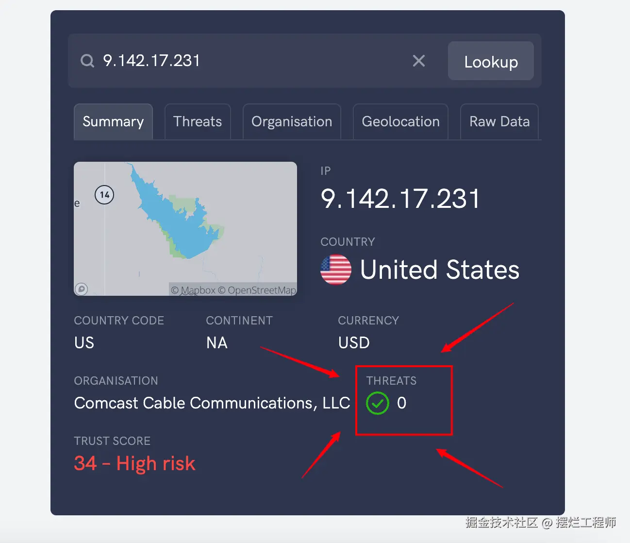 ping0.cc不一定准确,你还可以通过ipdata.co来查看IP是否存在欺诈指标: