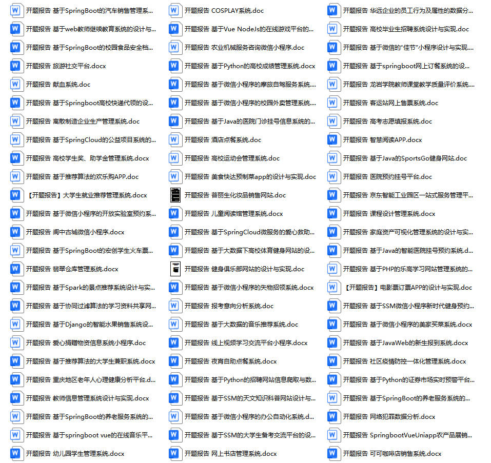 以上是某同学的毕业设计答辩的过程,如果你现在还没有参加答辩,还是开题阶段,已经选好了题目不知道怎么写开题报告,可以下面找找有没有自己符合自己题目的开题报告内容,列表中的开题报告都是往届真实的开题报告,可发送使用或参考。文末或底部来联xi可免费获取