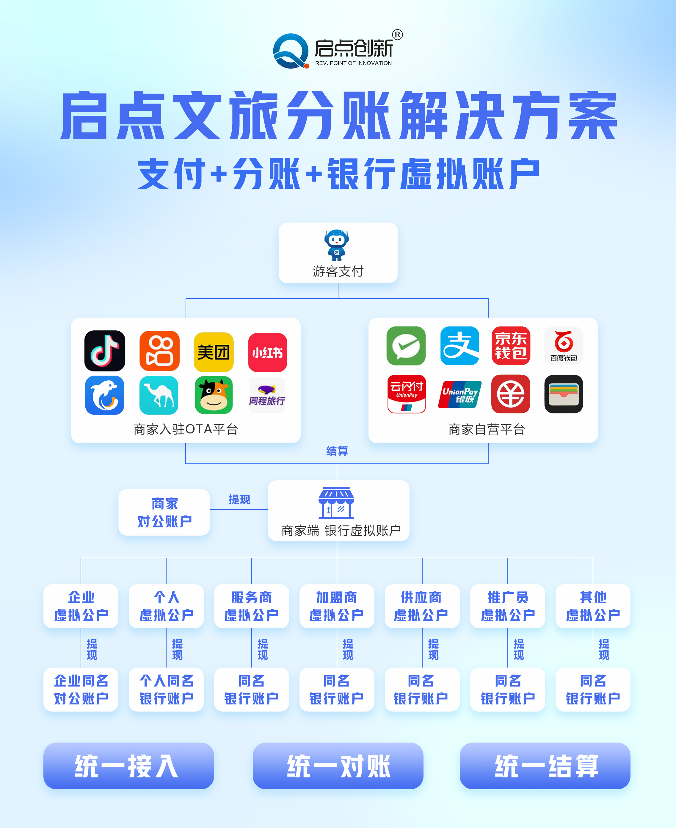 启点智慧景区多商户分账系统是启点创新专为文旅行业打造的数字化综合解决方案,聚焦景区及文旅综合体的多业态分账痛点,借助区块链、大数据、AI 等技术,实现资金流、信息流、客流的协同管理,助力景区从单一门票经济向多业态复合型商业生态转型,以下是其核心信息的详细介绍: