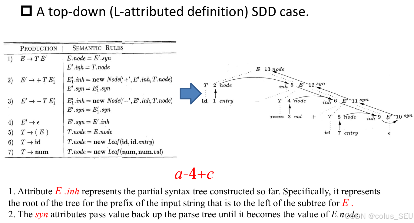 .inh自上而下传递,.node自下而上传递,最终合成完整语法树。