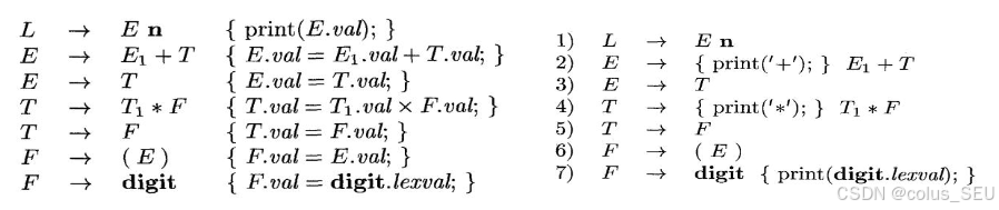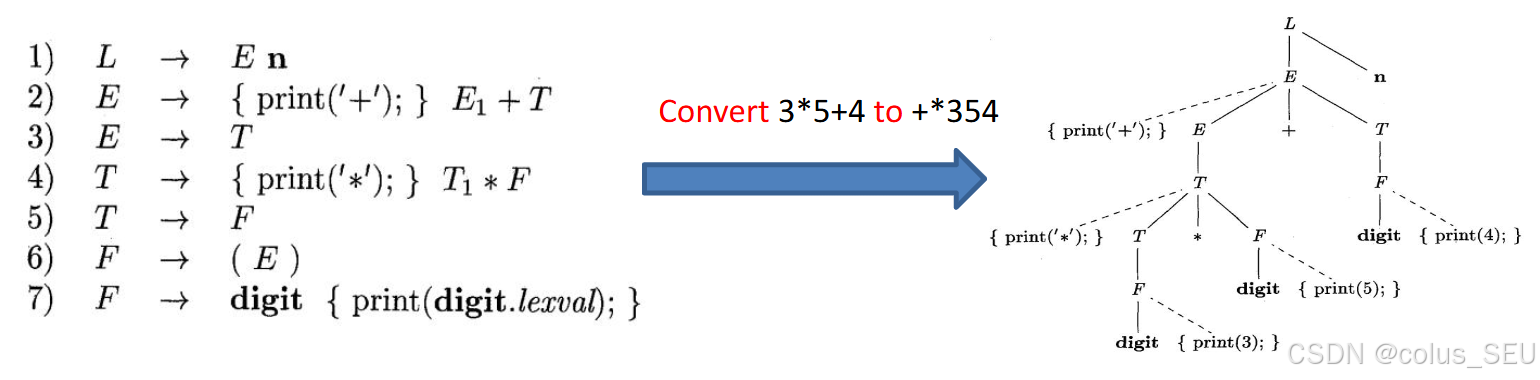 - 定义 :SDT Scheme 是一种在上下文无关文法(CFG)的产生式体中嵌入程序片段(称为语义动作,semantic actions)的机制。