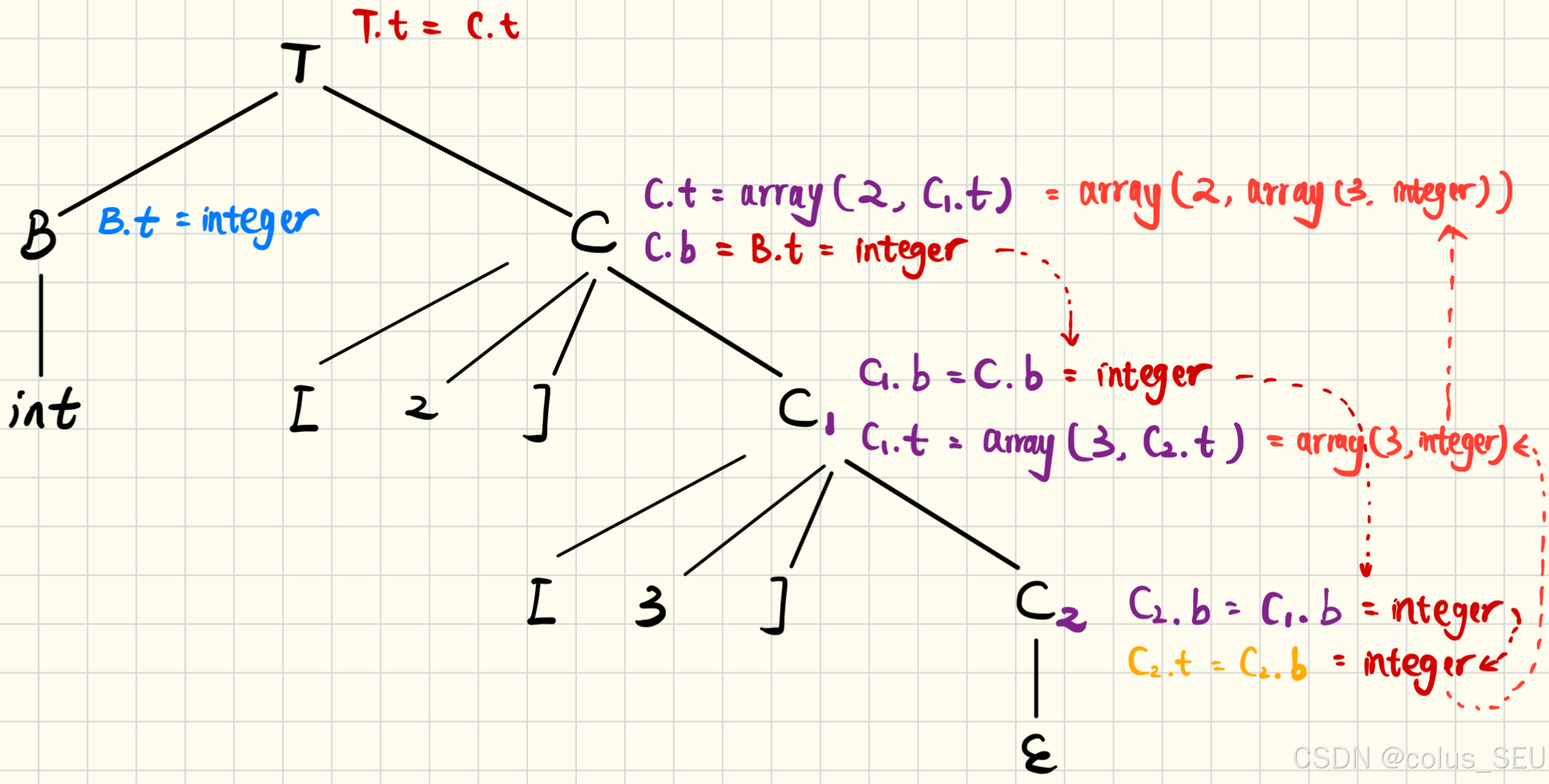 所有属性均为 综合属性(synthesized attributes),值从子节点向上传递。