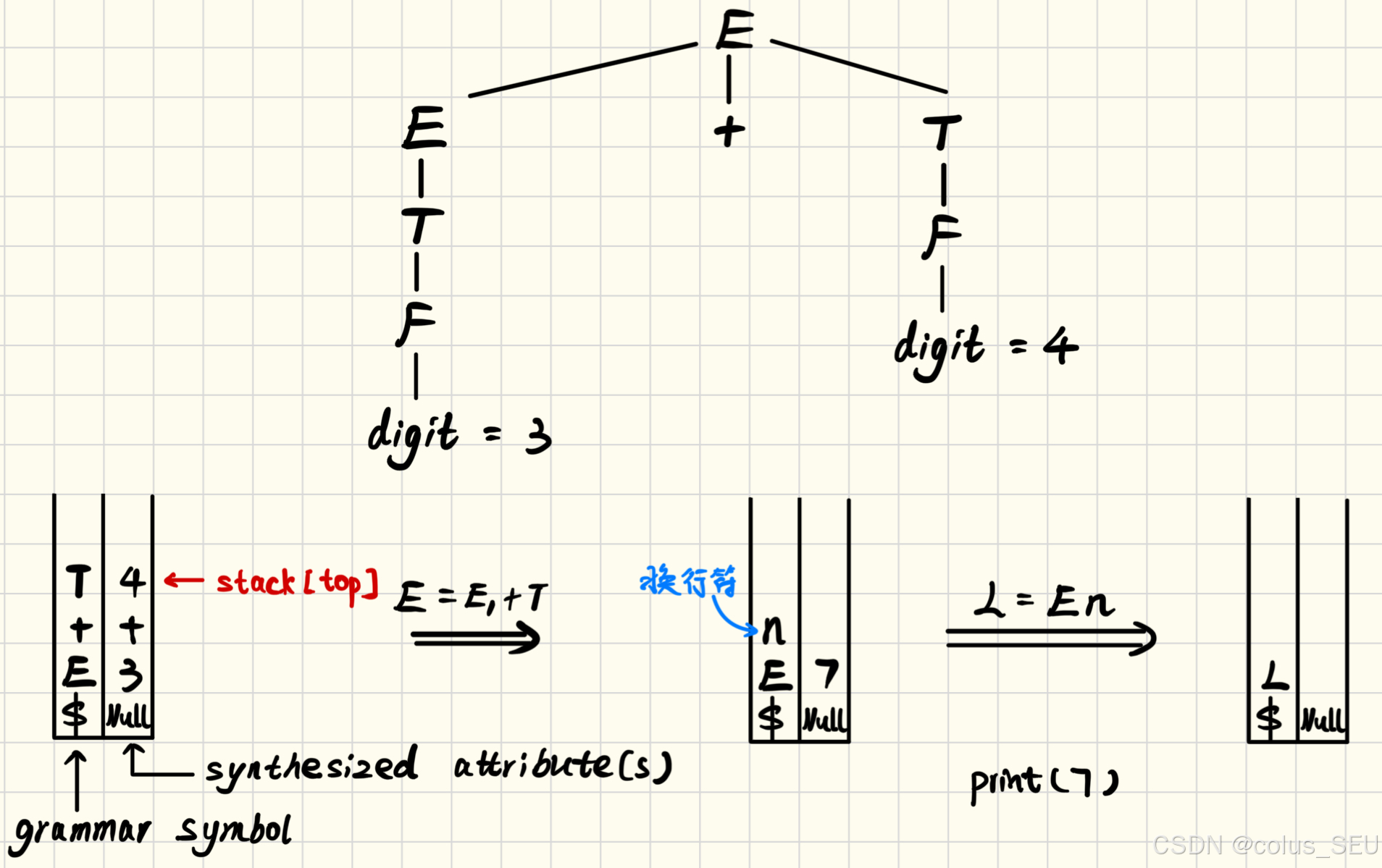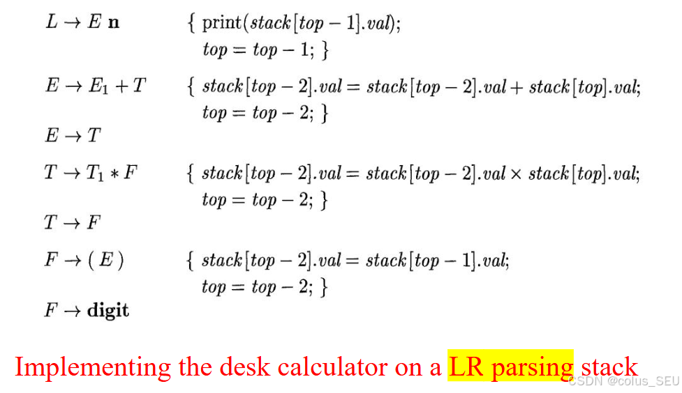 实现:在解析栈中为综合属性设置专门字段。例如,在桌面计算器中,当归约时,动作被执行,计算结果压入栈顶。