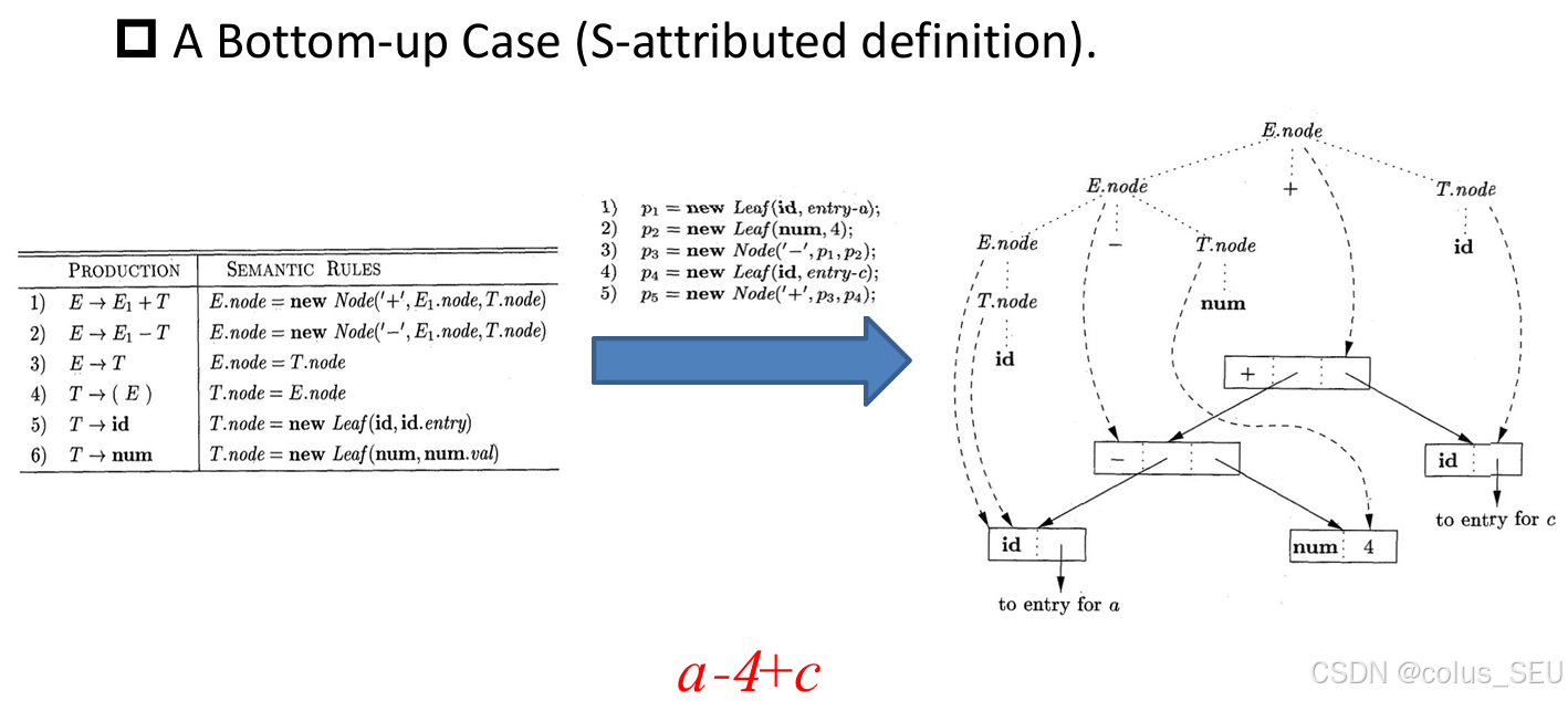 适用于 S-属性定义(S-attributed definition) 。(属性值仅由子节点(children) 和自身属性决定。)