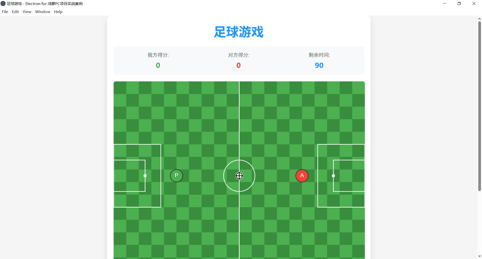 本项目是一个基于Electron开发的足球游戏应用,适用于鸿蒙PC平台。游戏中玩家控制足球运动员与AI对手进行一场小型足球比赛,目标是将足球踢入对方球门得分。