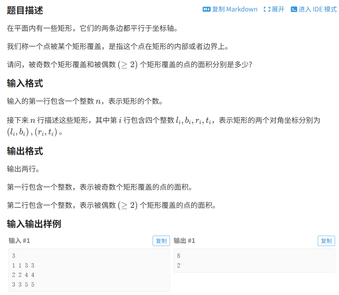 这道题则是涉及到了扫描线和线段树,我问了下AI,它是这么做的,将每个矩形拆分为上下两条水平边界扫描线(上边界标记添加覆盖,下边界标记删除覆盖),按y坐标升序排序扫描线;对所有矩形的x坐标离散化,构建线段树维护x轴区间的覆盖次数,实时计算当前y区间内奇数覆盖次数的长度和≥2次偶数覆盖次数的长度;扫描线从下到上移动,每次用当前有效长度乘以扫描线移动的高度差,分别累加得到两类覆盖面积,最终输出结果,时间复杂度O (nlogn),适用于大数据量场景。代码如下: