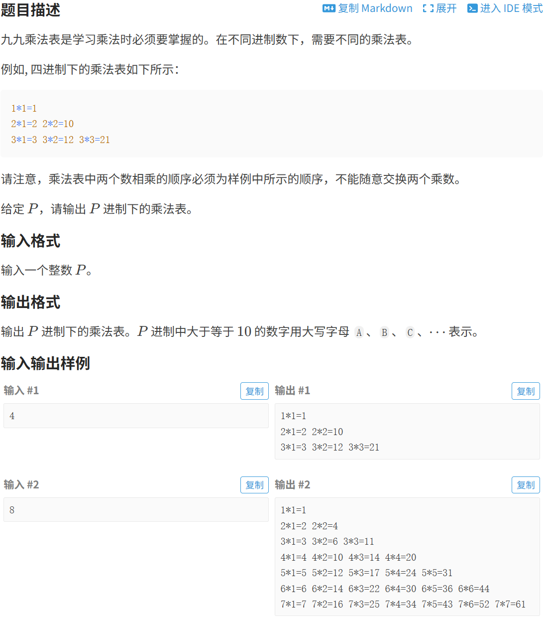 我的思路是通过signal数组建立0-9、A-Z与0-35的直接映射,以双重上三角循环(i从1到p-1、j从1到i)生成乘数组合,先计算十进制乘积sum,再根据sum是否小于p判断其p进制为1位或2位,分别通过signal数组索引取值存入tmp数组,最终按p进制乘数*p进制乘数=p进制乘积的格式输出,且仅在非行尾式子后加空格,形成无多余空格、布局整齐的p进制乘法表。我的代码如下: