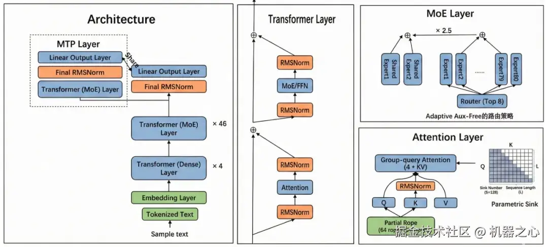 3)注意力架构的优化兼顾了精度与效率:通过增加 Query 头数和注意力头维度,让模型能从更多角度捕获细粒度语义关系;引入 Partial RoPE 机制,仅对 Query 和 Key 中 1/3 维度应用位置编码。通过将 KV 组数量减半,在 Key 头维度增加的情况下,仍实现了 37.5% 的 KV cache 缩减,平衡了推理阶段的显存占用、速度与模型效果。