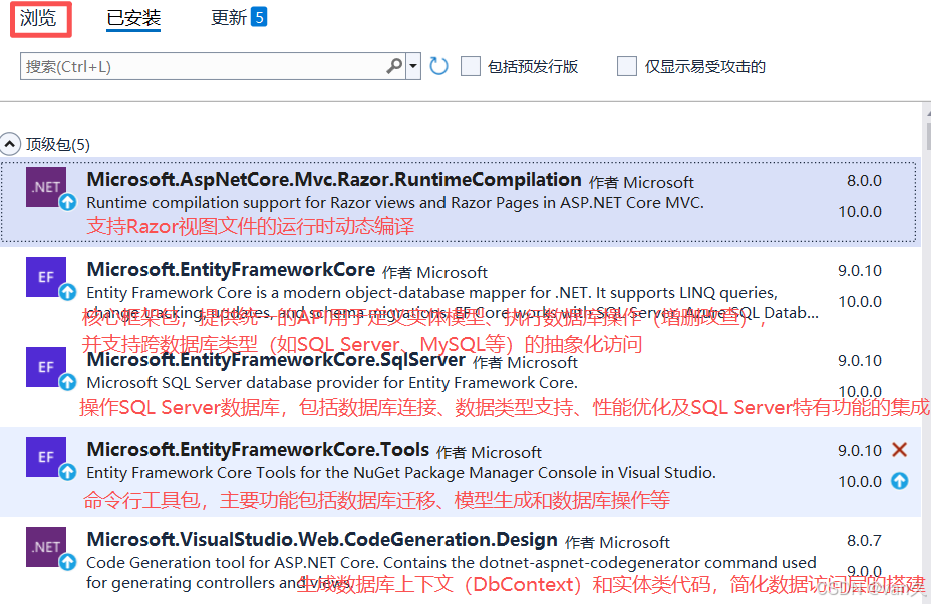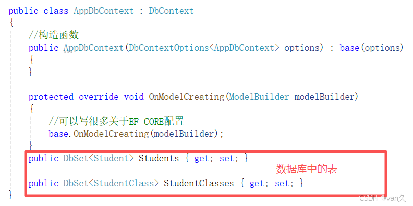 EF Core的核心类,负责与数据库的交互- 包含 DbSet 属性,表示数据库中的表