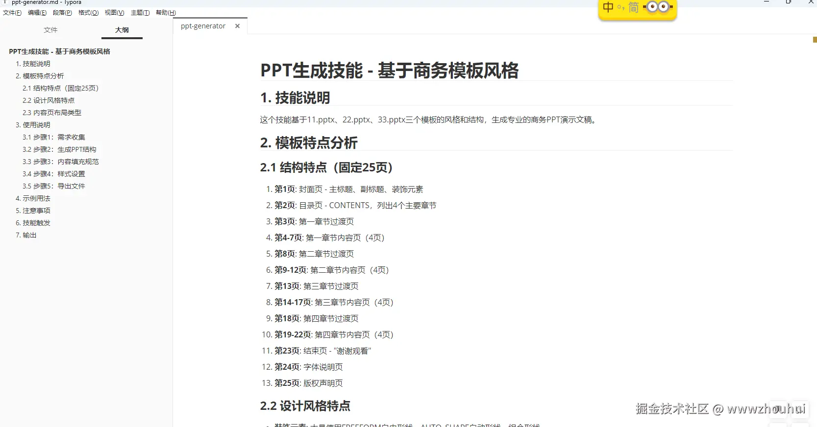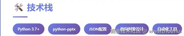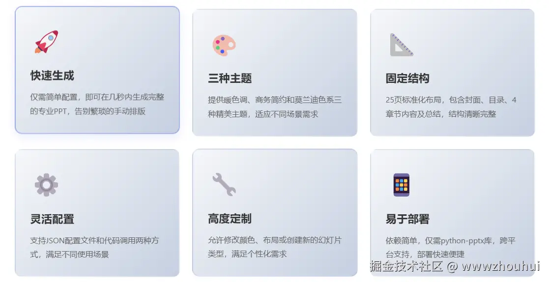 ppt-generator-skill 是一个基于 Python 的 PPT 自动生成工具,具有以下核心特性: