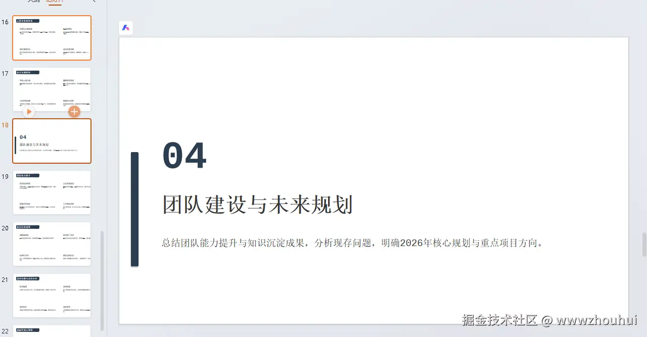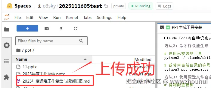 通过这套实践方案,小伙伴们能够高效突破传统PPT制作的时间成本瓶颈 ------ 借助准备3个参考模板、安装Skill_Seekers工具、调用Claude生成Skills、安装到Claude环境、一句提示词生成PPT 这五个步骤,无需繁琐的手动排版调整,就能快速完成符合特定风格标准的专业演示文稿(如本次演示的"2025年度运维工作复盘与规划汇报")。无论是年度工作总结、项目汇报、产品发布,还是业务复盘、技术分享、培训课件、商业计划,都能通过配置JSON文件或直接提示词完成,极大提升了办公效率和内容产出质量。