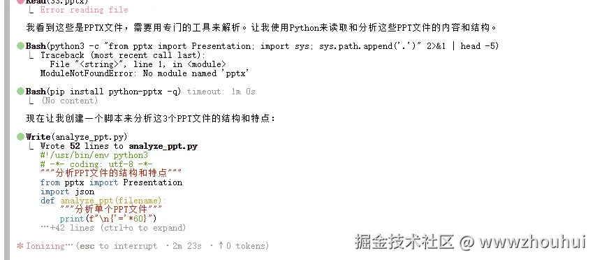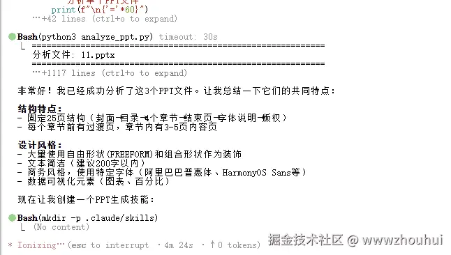 Claude首先会编写一个 analyze_ppt.py 脚本来分析PPT模板的特征。这个脚本会: