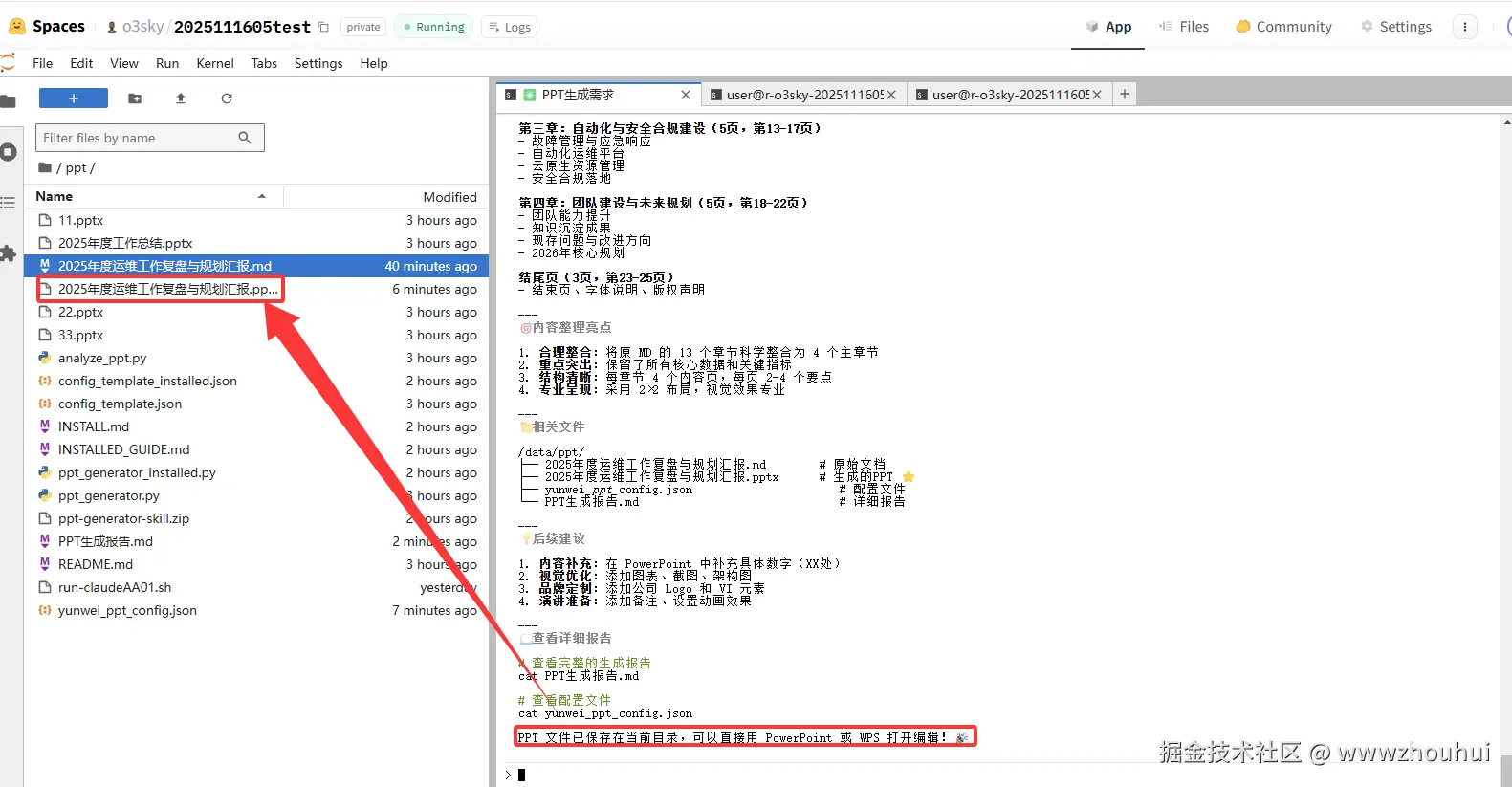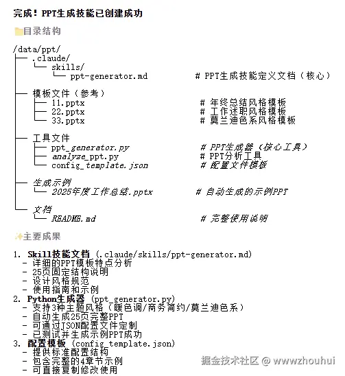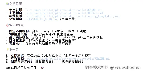 整个生成过程大约需要3-5分钟,完全自动化,无需人工干预。生成完成后,我们就得到了一个完整的ppt-generator-skill技能包!呵呵,是不是非常简单?