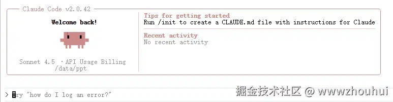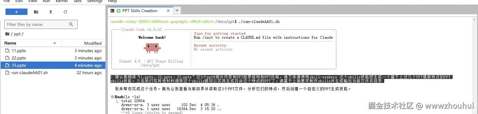 现在进入 Claude Code 运行环境,这是最关键的一步。我们要让AI自动分析PPT模板,并生成Skills技能包。