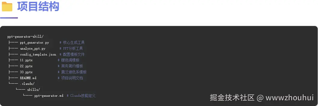ppt-generator-skill 通过智能分析现有PPT模板,自动提取设计规范并生成符合标准的新演示文稿,实现了从"重复劳动"到"智能创作"的跨越。这2天这个项目非常火爆,今天我们就手把手教大家如何制作和使用这个PPT生成器Skills,体验和感受一下AI辅助办公的强大能力。