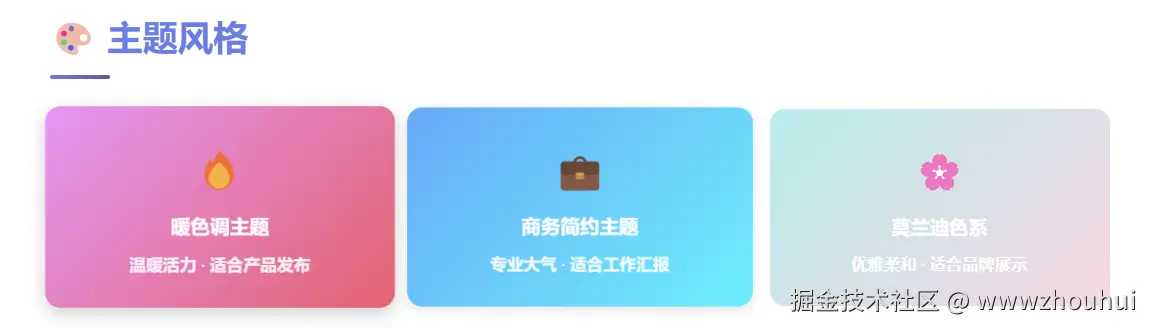 - 🎯 多主题支持:内置商务简约、暖色调、莫兰迪色系三种主题风格
