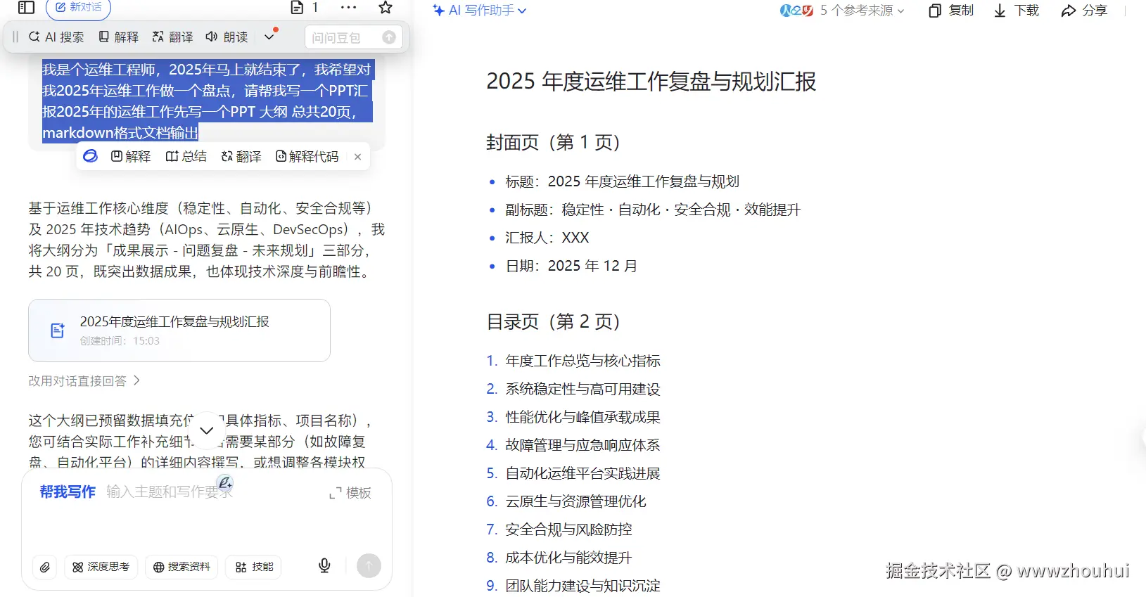 为了测试这个Skills的效果,我们需要准备一个测试用的内容大纲。我这里用豆包AI生成了一个"2025年度运维工作复盘与规划汇报"的PPT大纲,总共20页内容。