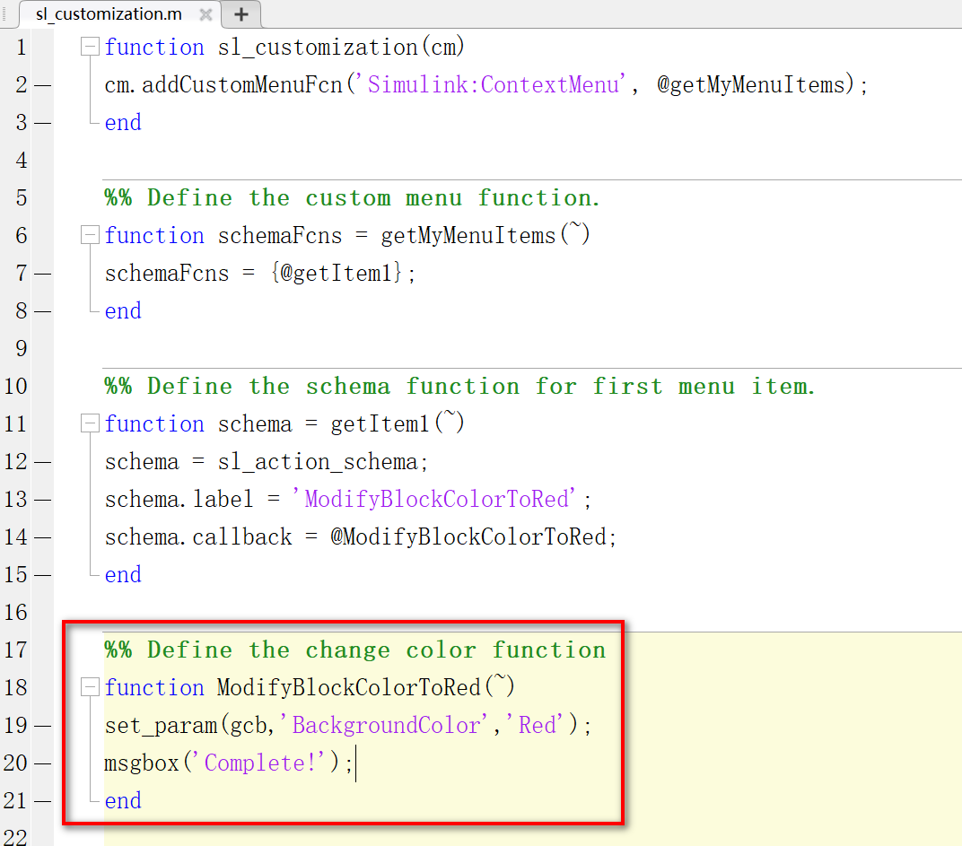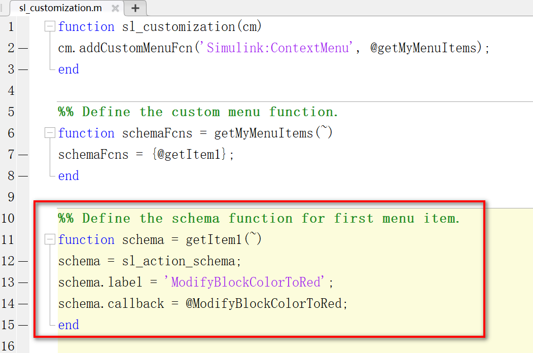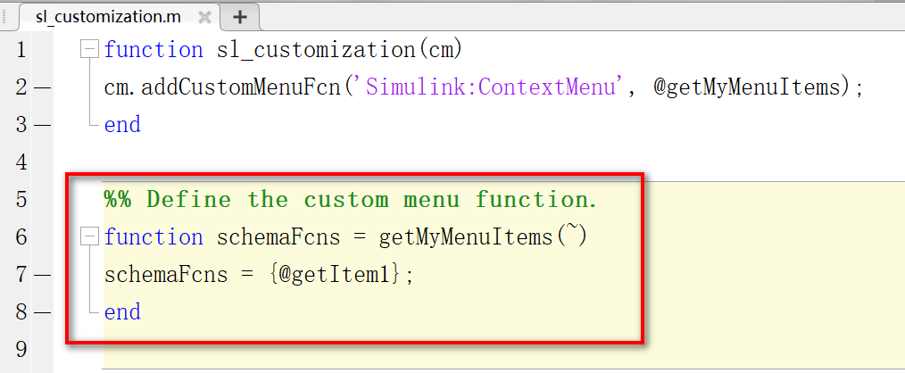 在sl_customization.m的后面继续添加项目组的函数,也就是2.1节中的回调函数@getMyMenuItems。