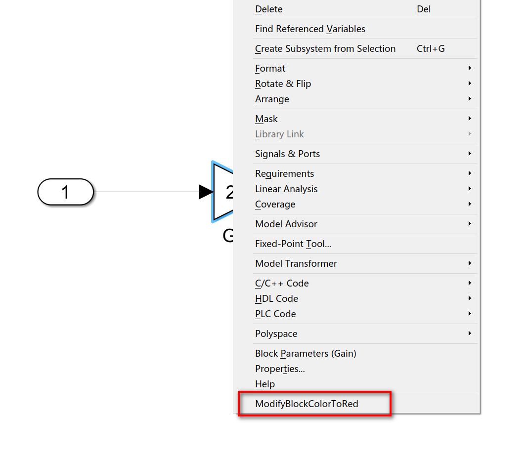 3)在Gain模块上右键,可以看到菜单的最下面多了一个ModifyBlockColorToRed。