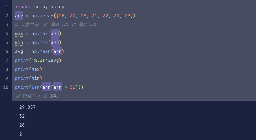 - 某城市一周的最高气温(℃)为 [28, 30, 29, 31, 32, 30, 29]。