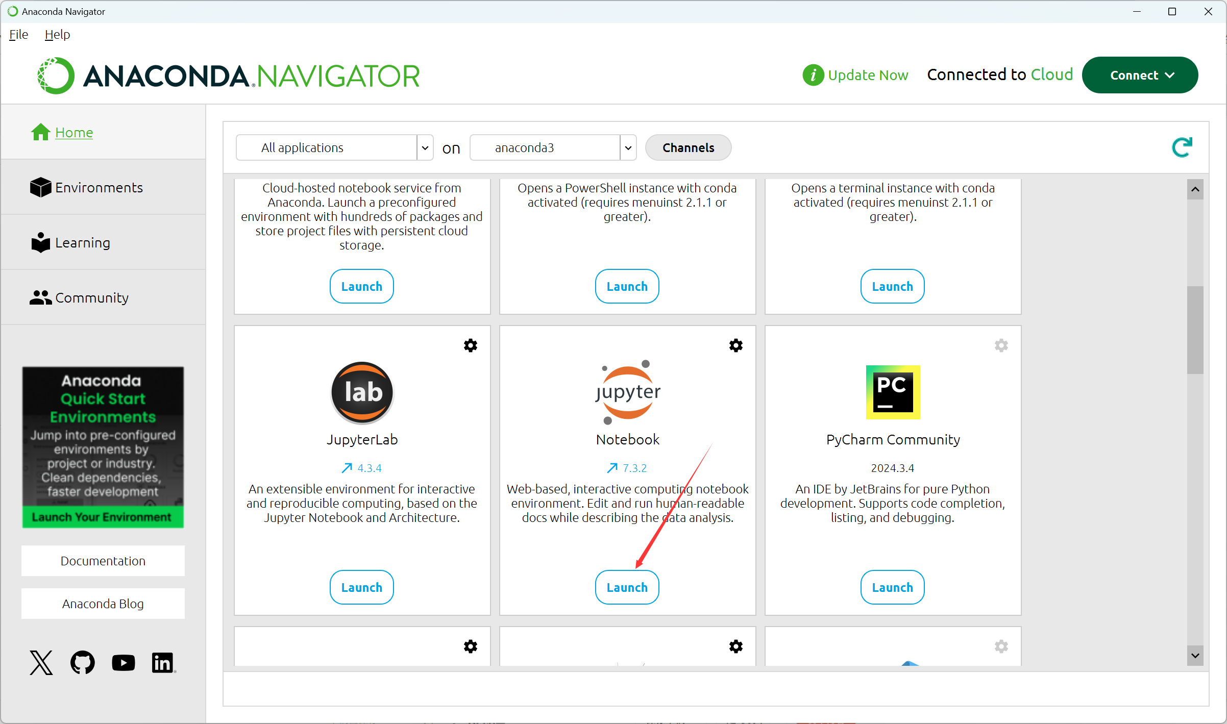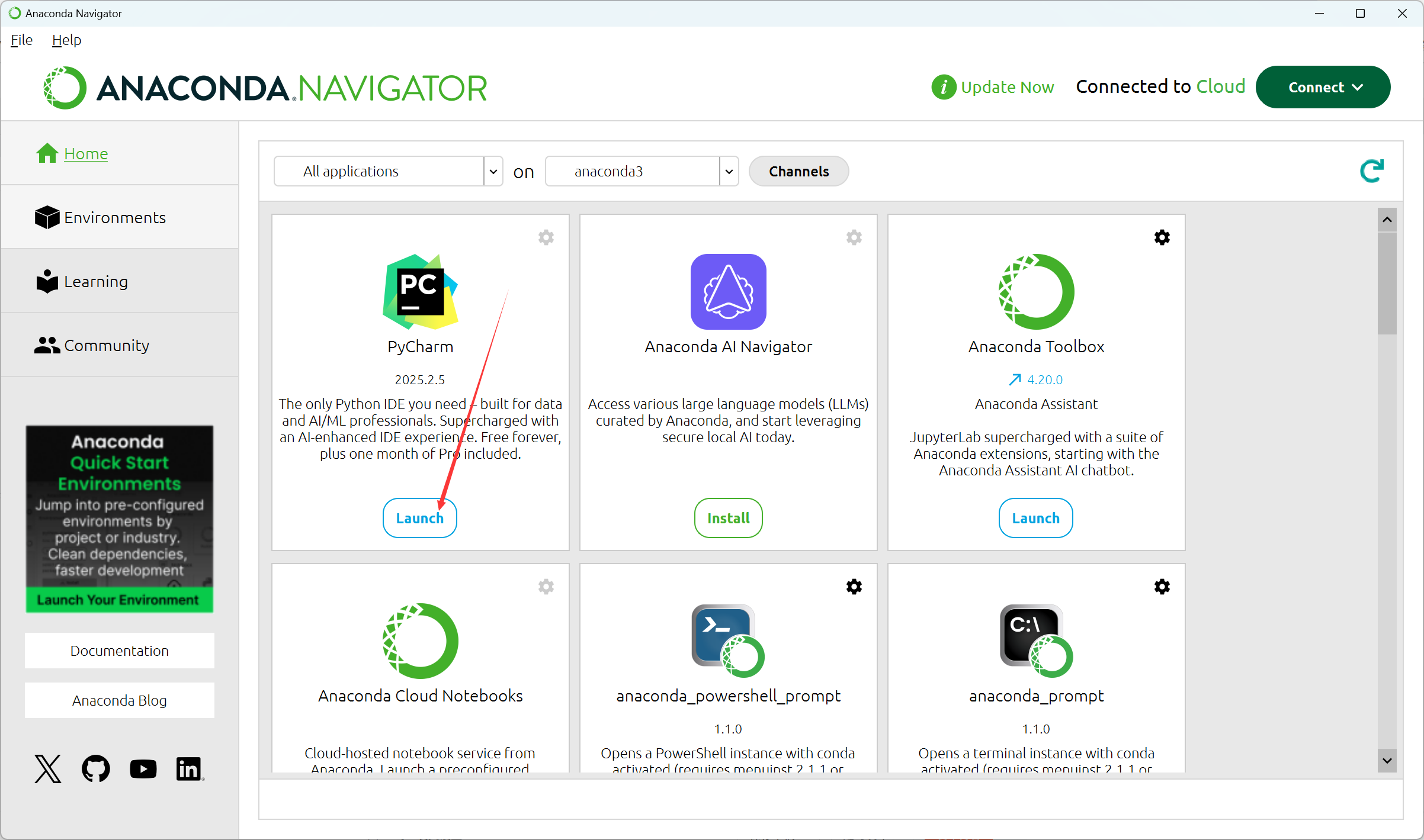 - 在anaconda Navigator 中 下载jupyter 安装pycharm