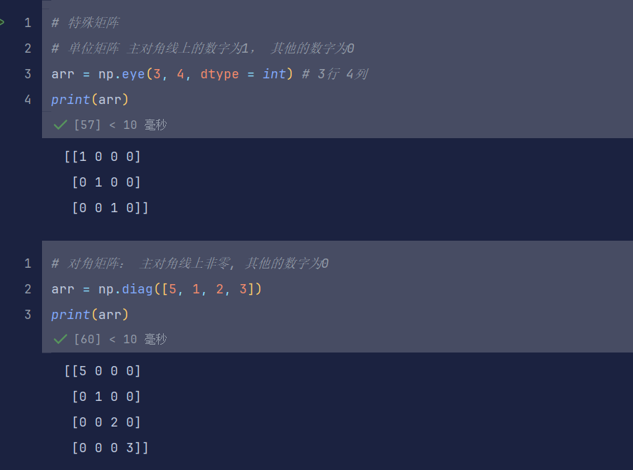 - 特殊矩阵生成:专门用来做数学计算的数组(比如那种 "对角线是 1、其他是 0" 的矩阵)。