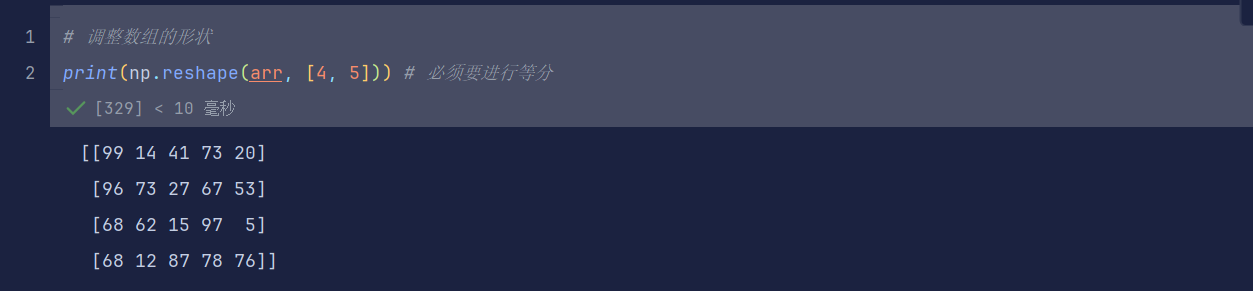 调整数组的形状 np.reshape(arr, [4, 5]) 必须要进行等分 每一行的个数都要相等