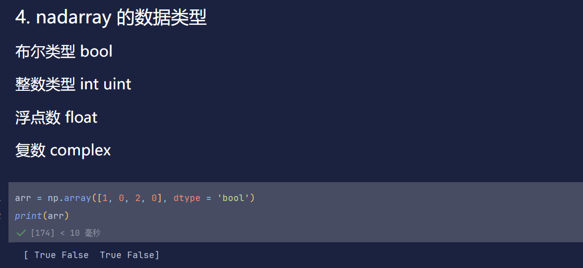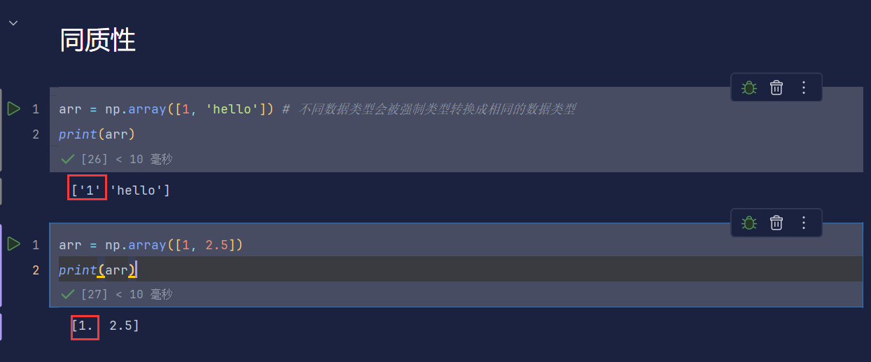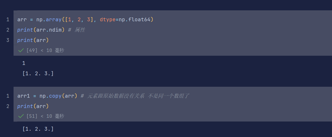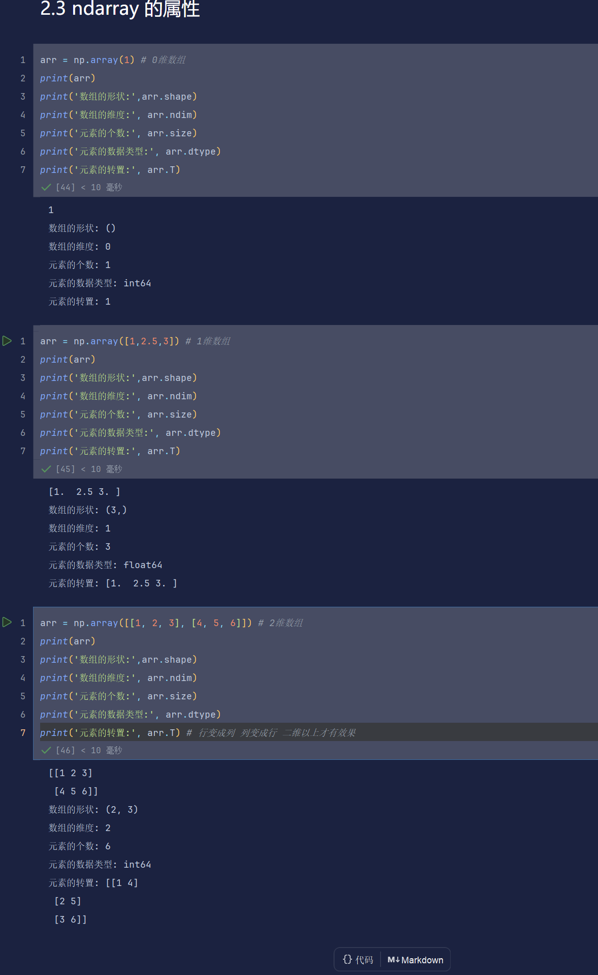 | dtype | 元素类型:数组中元素的类型(整数、浮点数等)。 | arr.dtype |