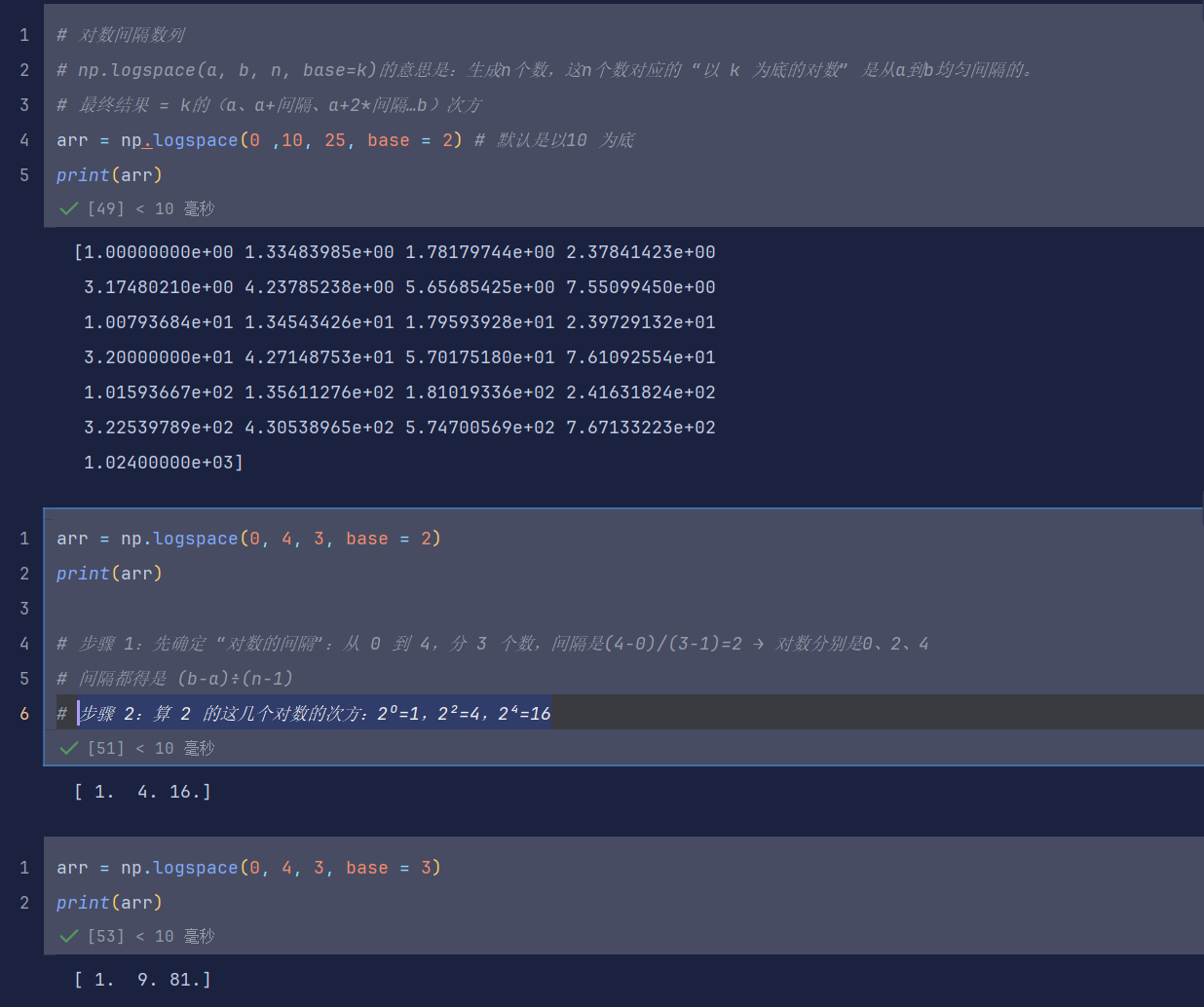 [np.logspace(a, b, n, base = k) 对数间隔数列](#np.logspace(a, b, n, base = k) 对数间隔数列)