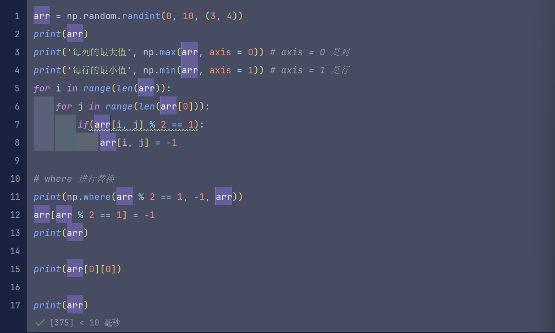 - 生成一个 (3, 4) 的随机整数数组,范围 [0, 10)。