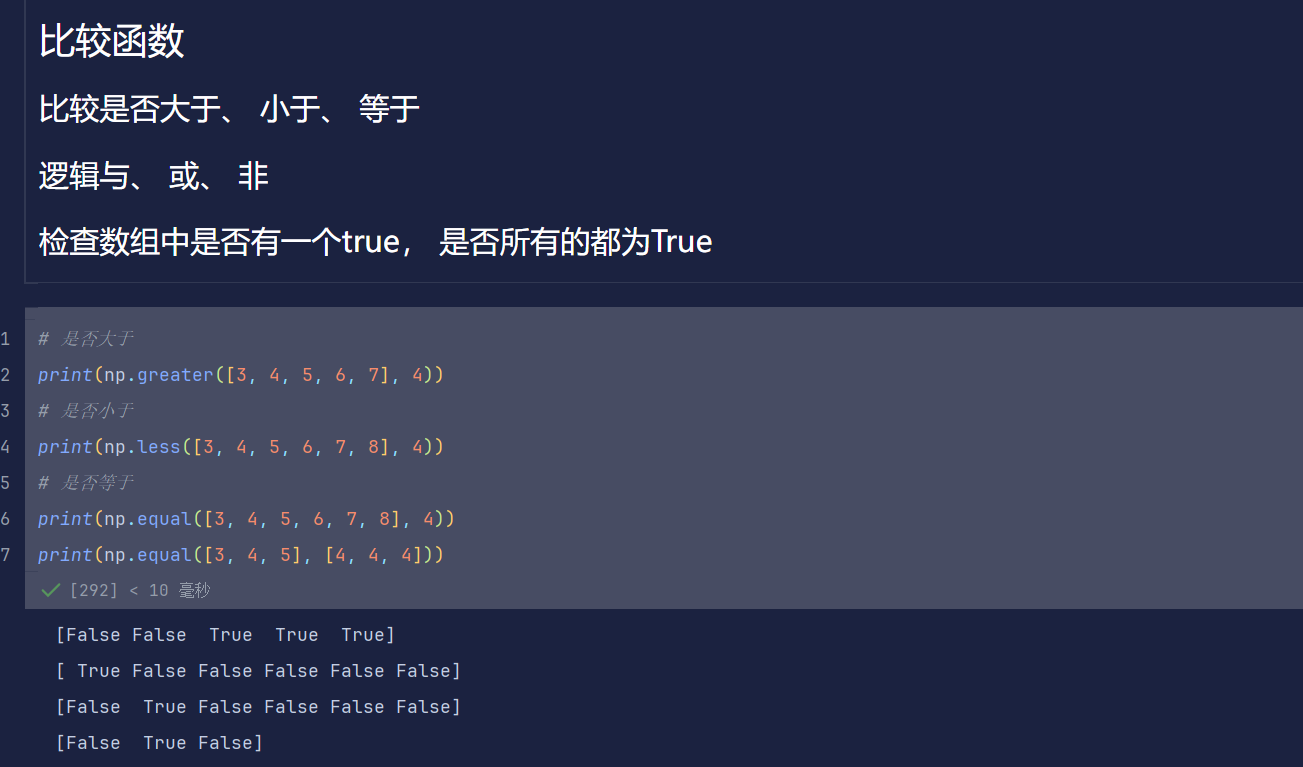 是否大于(np.greater([], 4))、小于(np.less([], 4))、等于(np.eqaul([]), 4)