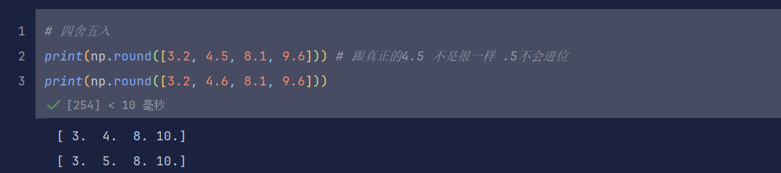 四舍五入 但是.5 在python中会舍掉 np.round([])
