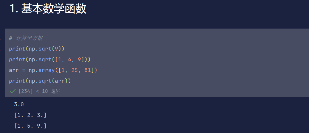| 基本数学 | np.sqrt(x)、np.exp(x)、np.log(x)、np.sin(x)、np.abs(x)、np.power(a, b)、np.round(x, n) |