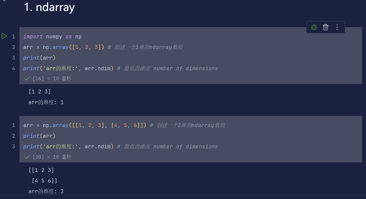| ndim | 维度数量:数组是几维的(1 维、2 维、3 维等)。 | arr.ndim |