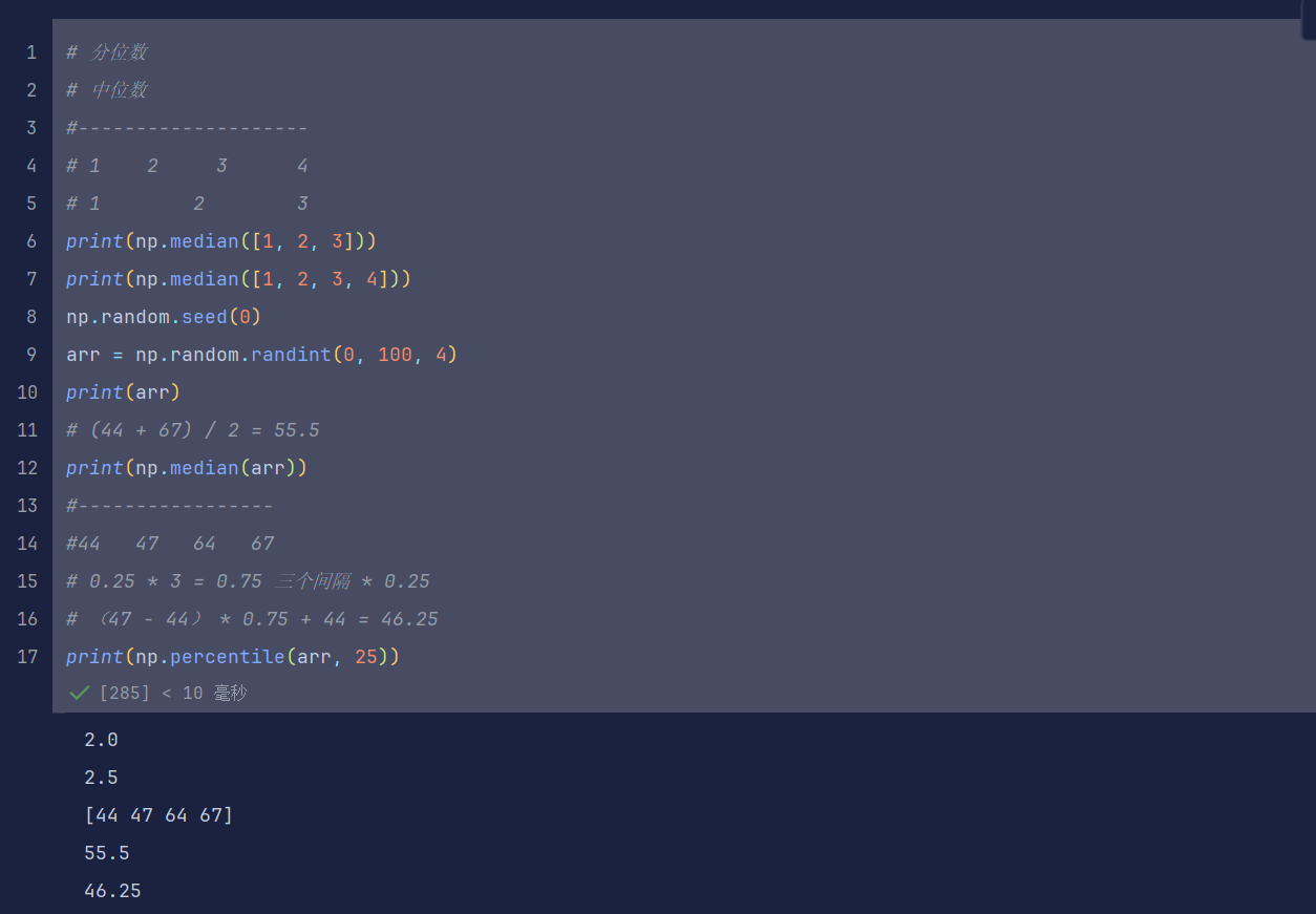 计算分位数(np.percentile([], 25)) 和 中位数(np.median([]))