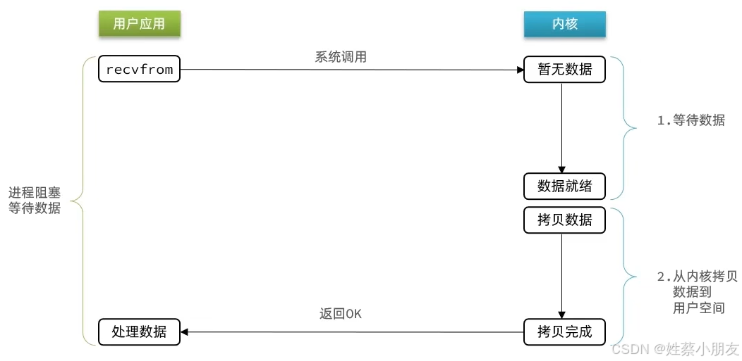 但是阻塞I/O的缺点是等待客户端数据、中断处理程序写数据到内核缓冲区、将数据写回用户空间过程中服务器进程会一直阻塞等待。